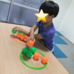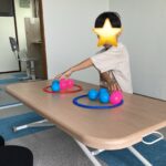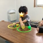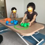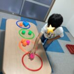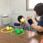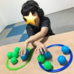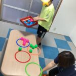 目👀と手🖐️の協調運動でカラフルなボールと輪っかを使いました。まずは、色合わせ2〜4種類の色で考えながら「アレ❓」と首を傾げるみんな😉出来るとハイタッチ🙌お友達や職員と楽しくトレーニングできました。