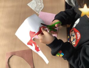 最後の仕上げにはリボンや細かく刻んだ折り紙をトッピングに見立ててデコレーション。色の組み合わせを考えながら、世界にひとつだけの“オリジナルチョコ”が完成しました。